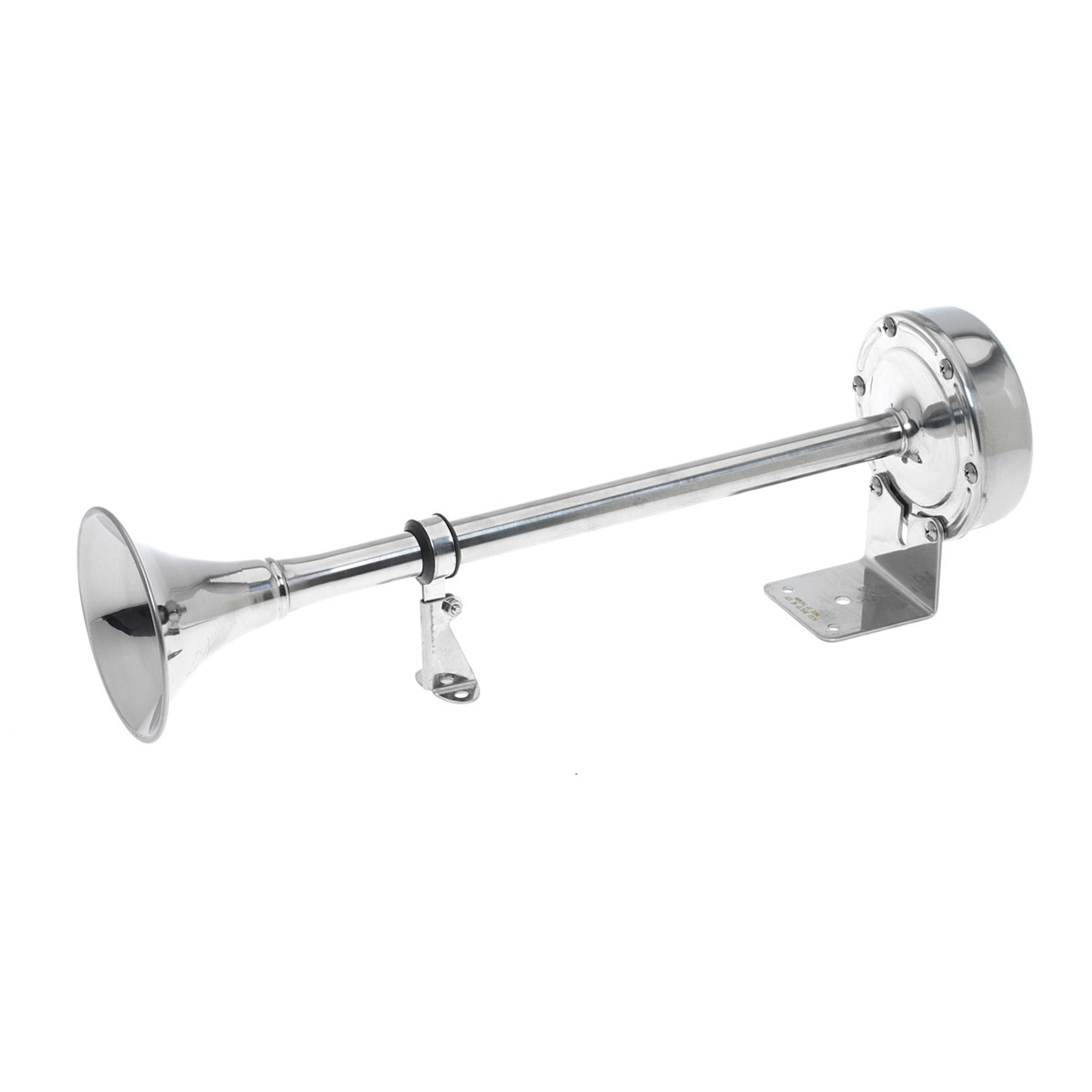 Helt i rostfritt stål. Utmärkt för saltvatten. En uppgradering av de flesta signalhorn. Mått: L=420 mm, B=102 mm, H=120 mm. 12 V.
