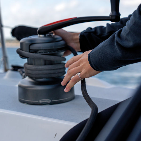 Vesillä QuickTrim-järjestelmän käyttö on intuitiivista. Kun pidät yhdellä kädellä yläkantta kiertämällä sitä vastapäivään, irrotat otteen köydestä, jotta voit tehdä nopeita säätöjä. Kun päästät irti yläsuojuksesta, se jousittuu takaisin ja tarttuu köydestä kiinni, jolloin se palaa normaaliin käyttöön. Tämä yksinkertainen ja luotettava toiminto on suuri etu usein toistuvissa, pienemmissä trimmauksissa.